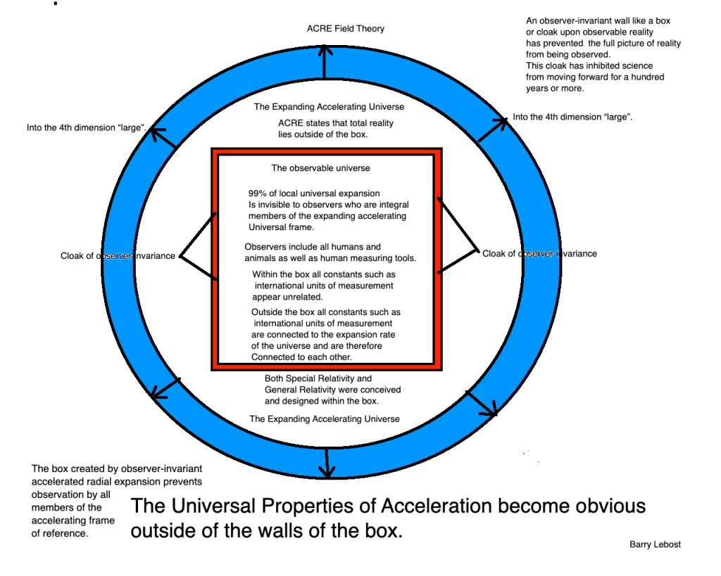 Reality therefore has two possible observations. One based upon the human observer that is an integral member of an accelerating frame of reference that cannot see any motion because of observer -invariance including all measurements derived by devices that are integral members of the same accelerating frame. The other is the observation of a non- participating member observer that can “see” the motion of all acceleration in the frame of reference from some hypothetical outside position of reference. For example: an observer that sees the sun moving across the sky verses an observer that is outside the box of observer invariance and can “see” the turning of planet Earth. This seeing constitutes a knowledge of truth even if it cannot be directly observed. This duality is a fundamental truth that exists in both the macro world and the quantum world.